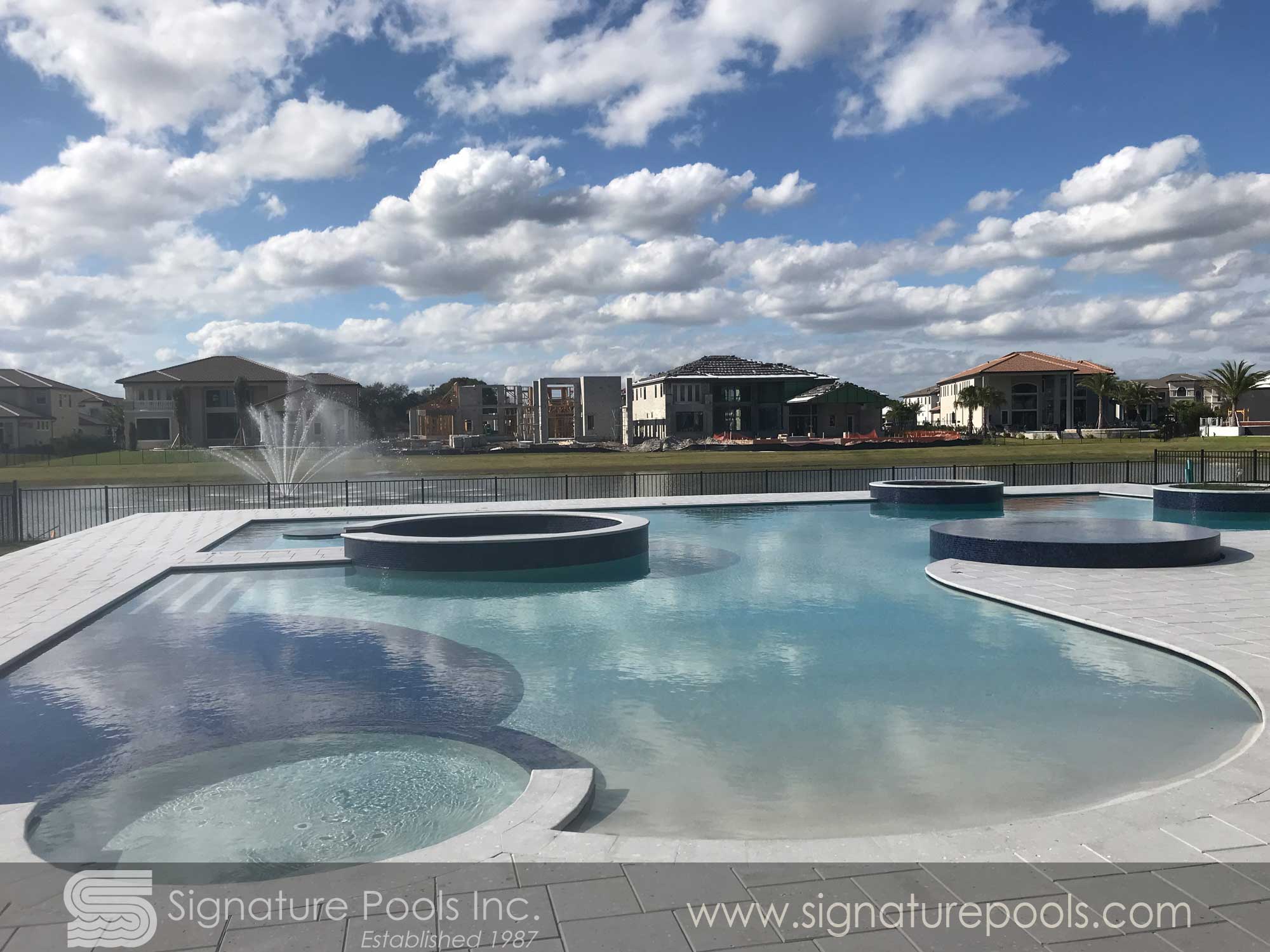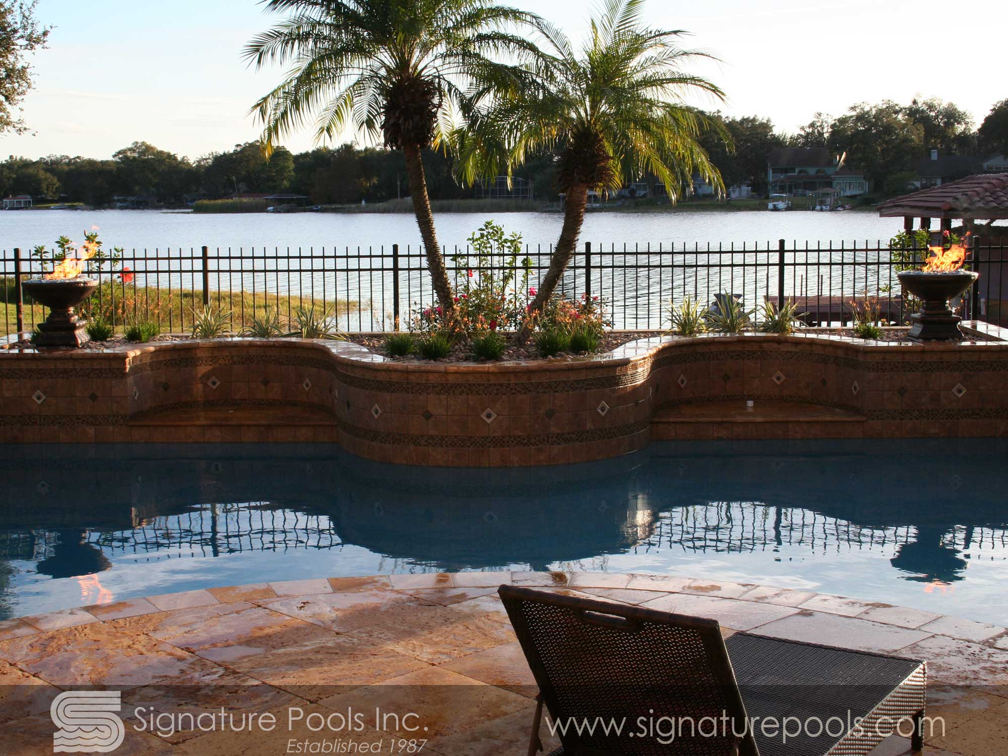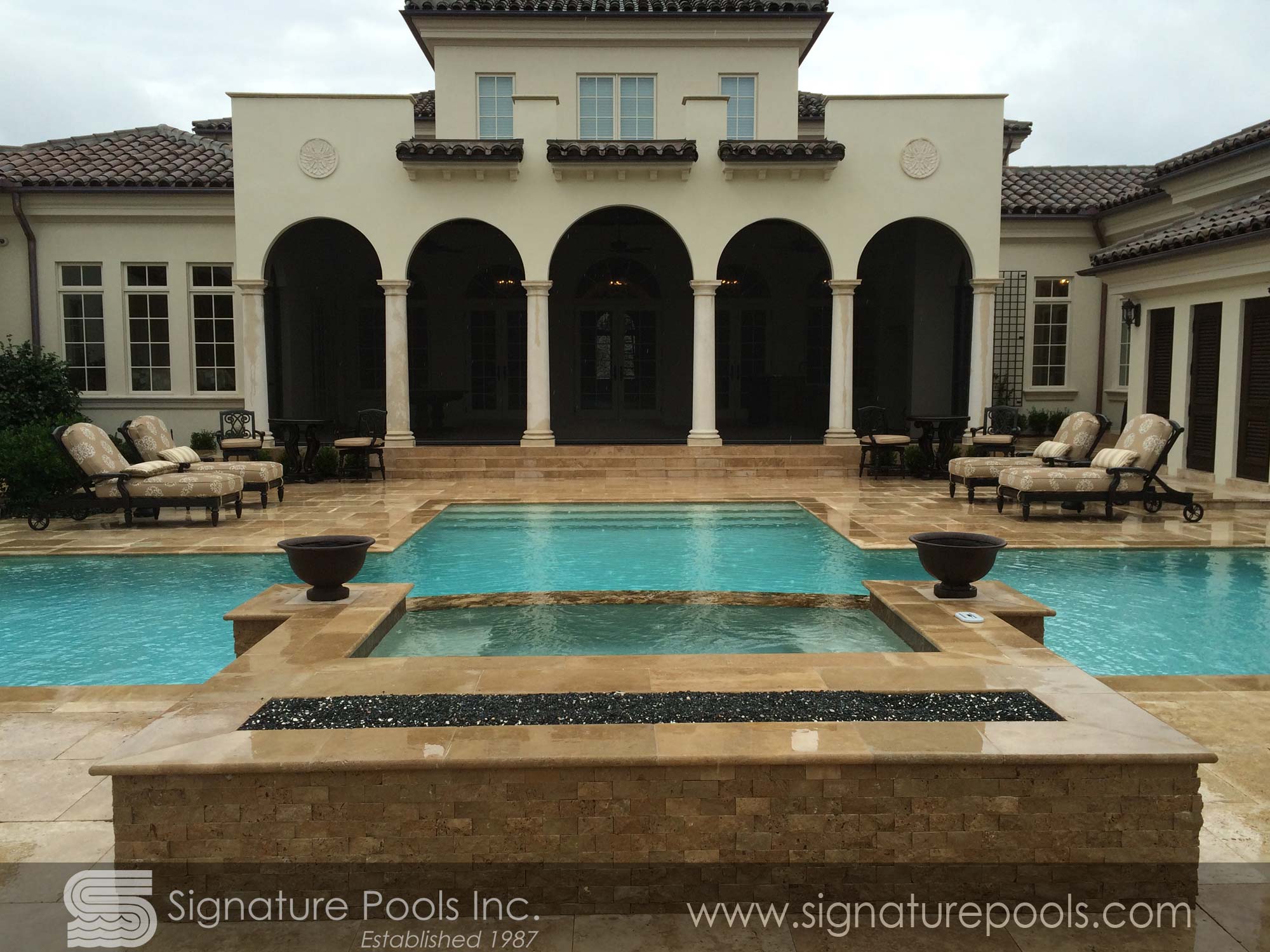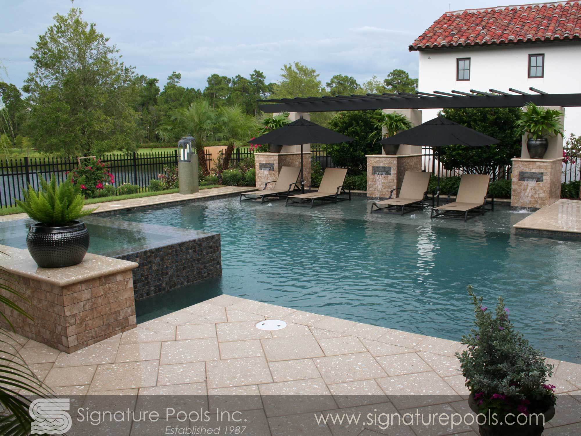 Curvilinear Pool Design with Sunken Fire Pit Overflow Spa Zero Entry
