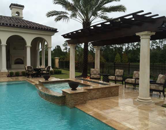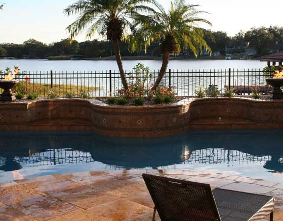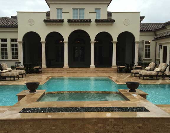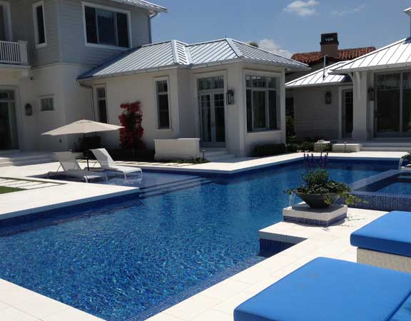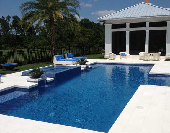 A linear or geometric pool design style tends to produce a very nice and clean look. The line pool design styles are usually accomplished with a combination of clean, straight lines and geometric shapes. The tiles are paved around the perimeter. The deck is brick, tile or stamped concrete. Ceramic, glass or mosaic tiles are added to the waterline.